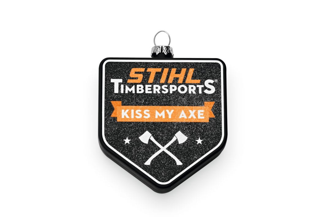 Dla fanów: bombka świąteczna TIMBERSPORTS ® w specjalnej edycji „Kiss My Axe”. Bombka jest w kolorze czarnym z nadrukowanym logo. Ta dekoracja choinkowa pięknie prezentuje się także w połączeniu z innymi bombkami bożonarodzeniowymi STIHL.
