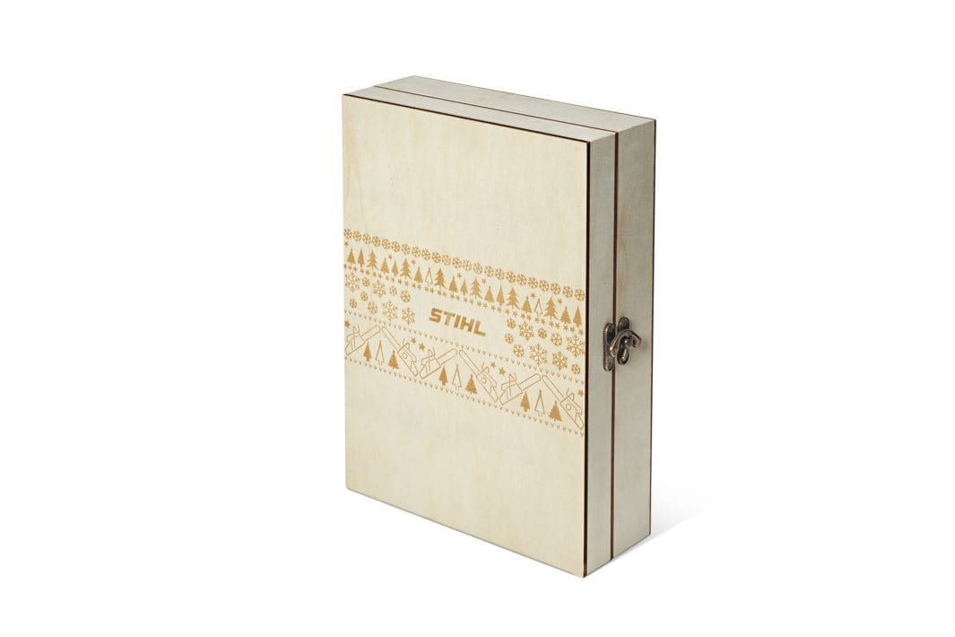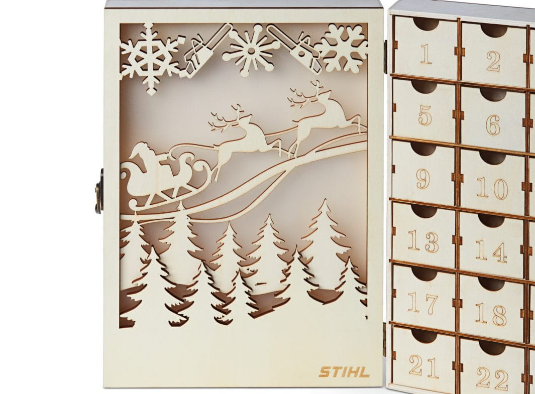 24 dni oczekiwania na Boże Narodzenie każdego roku. Ten drewniany kalendarz adwentowy STIHL jest ponadczasowo piękny i można go używać tak często, jak chcesz. Kalendarz otwiera się jak książkę. Przód zdobi typowy motyw bożonarodzeniowy STIHL. Motyw podzielony jest na dwa poziomy, tworząc piękny efekt 3D. Po prawej stronie kalendarza znajdują się 24 drzwi z wygrawerowanymi laserowo numerami. Kalendarz jest ekologiczny nie tylko dlatego, że można go ponownie wykorzystać, ale także dlatego, że drewno posiada certyfikat FSC.
