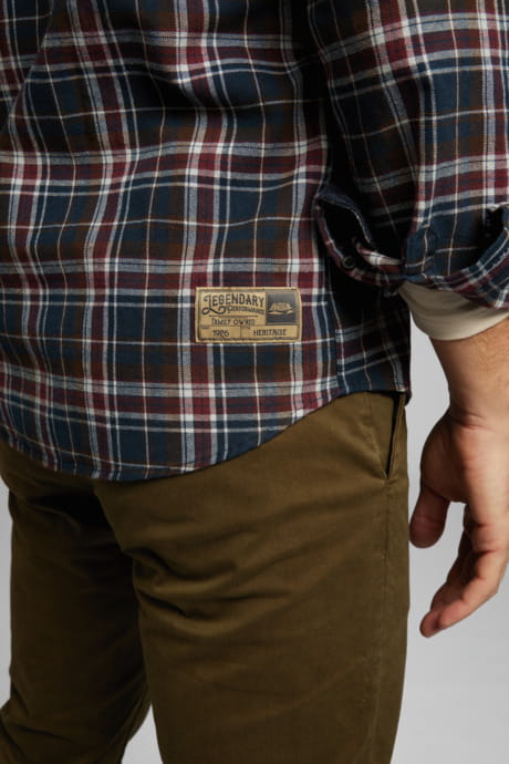 Męska koszula flanelowa, wzór w kratkę, do wyboru w zestawieniu kolorystycznym zielony / beżowy lub niebieski / czerwony. Listwa guzikowa, koszulowy kołnierzyk i naszywane kieszenie. Plakietka STIHL Heritage z tyłu, po prawej stronie. Haftowany napis LEGENDARY PERFORMANCE na spodniej części listwy guzikowej.