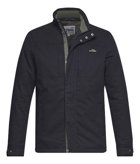 Ciemnoszara kurtka outdoorowa wykonana w 73 % z bawełny i w 27 % z poliamidu, z zieloną podszewką ozdobioną motywem pilarek łańcuchowych i kołnierzem typu stójka. Zakryty zamek błyskawiczny, dwie kieszenie na piersi, dwie kieszenie boczne i wydłużone plecy sprawiają, że kurtka ta jest funkcjonalna i wszechstronna podczas wypadów na łono natury. Motyw pilarki łańcuchowej na lewej piersi i korkowa aplikacja na plecach stanowią idealne uzupełnienie stylu kurtki.