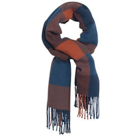 Kolor pomarańczowo-niebieski w kratę, 100% akryl, 50 x 180 cm, z frędzlami na końcach.