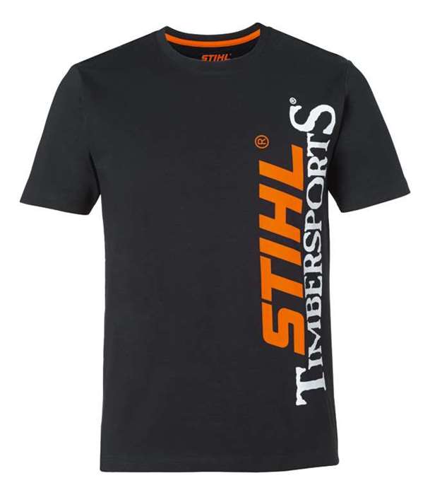Kolor czarny, 100% bawełna, nadruk STIHL TIMBERSPORTS w kolorze pomarańczowym i białym.