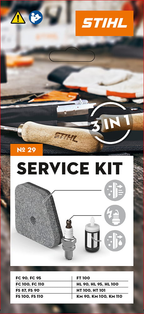 Zestaw serwisowy nr 29 umożliwia samodzielną wymianę podstawowych części eksploatacyjnych w kosach spalinowych STIHL FS 87,90,100,110 oraz innych urządzeniach spalinowych HL 90, 95, 100, HT 100, 101. KM 90,100,110 FC 90,95,100,110. FT 100. Regularna wymiana części eksploatacyjnych zwiększa niezawodność i żywotność urządzenia.
