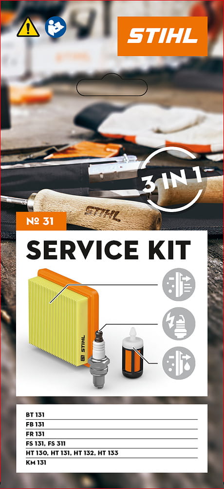 Zestaw serwisowy nr 31 umożliwia samodzielną wymianę podstawowych części eksploatacyjnych w kosach spalinowych STIHL FS 131/311, FR/FB 131 oraz innych urządzeniach spalinowych HT 130/131/132/133, KM 131, BT 131. Regularna wymiana części eksploatacyjnych zwiększa niezawodność i żywotność urządzenia.